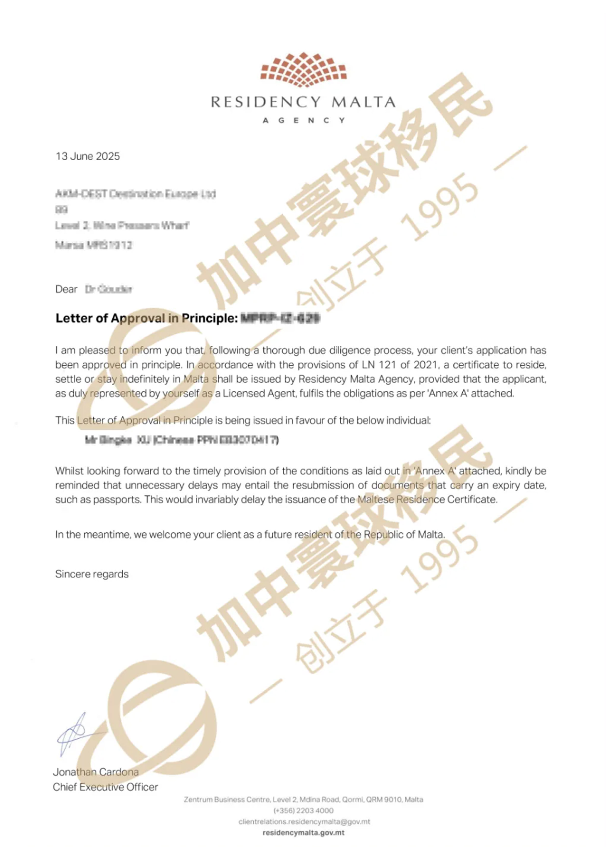 基于對地中海高質量養(yǎng)老生活需求的深刻理解,加中寰球團隊為其精心籌劃了馬耳他永久居留方案。憑借專業(yè)的移民法律素養(yǎng)和豐富的文案處理經驗,團隊重點協助X先生嚴謹梳理并證明了名下多年經營教育產業(yè)的資產積累歷史與來源合法性,系統(tǒng)性地準備并完善了整套申請材料。其申請材料組織嚴謹周密、條理清晰、證明充分有力,最終順利通過審核,成功獲批!我們衷心祝賀X先生及其家人開啟地中海新篇章!