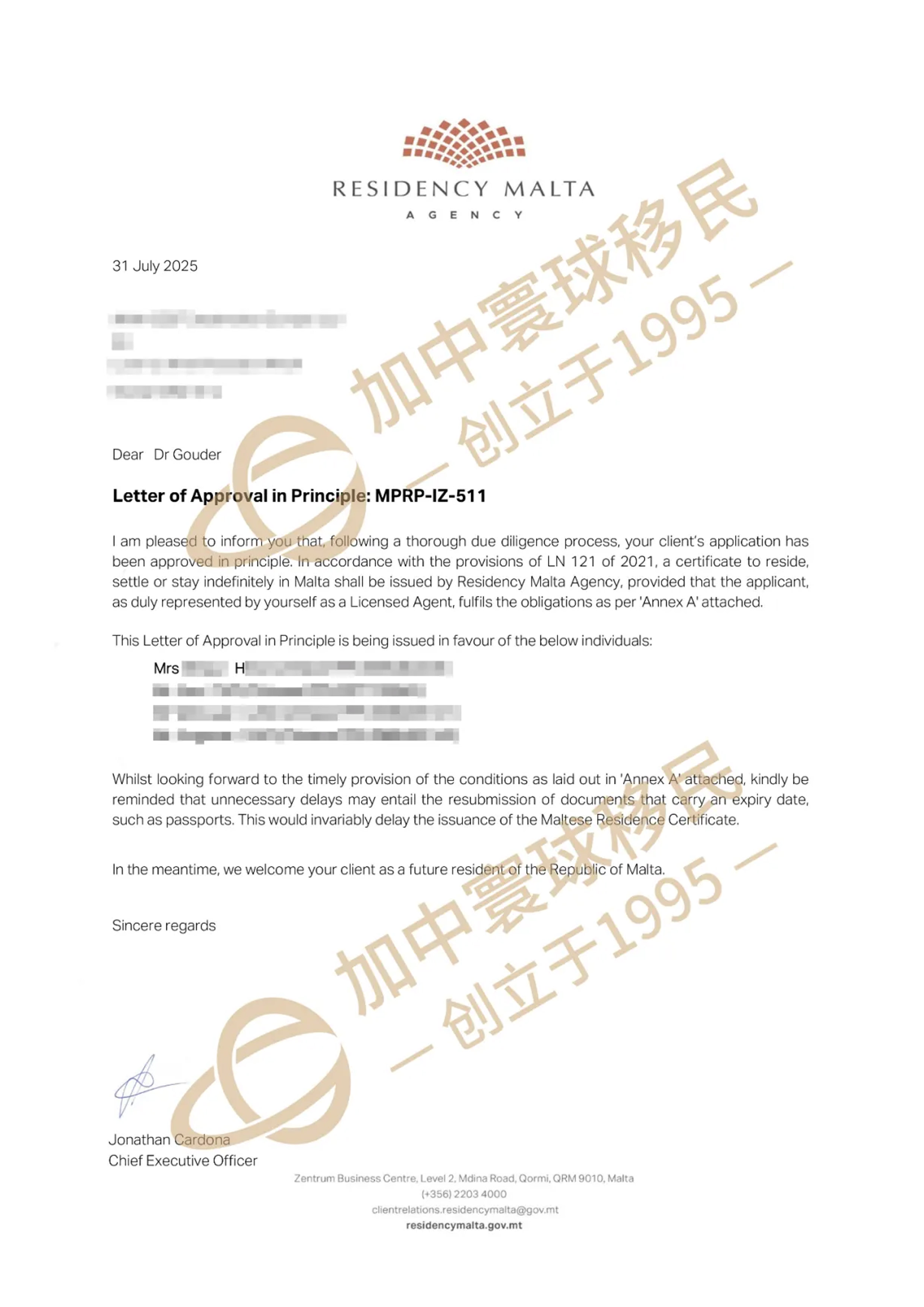 去年,H 女士找到了我們加中寰球,希望能為自己和家人規劃一個理想的身份。在與我們顧問進行了深入、細致的咨詢后,結合自身需求和家庭情況,她毅然選擇了馬耳他移民。我們的文案團隊在對 H 女士進行全面的移民評估后,為她量身定制了專屬的移民方案。經過一系列專業、高效的操作,如今終于迎來了順利獲批的好結果!