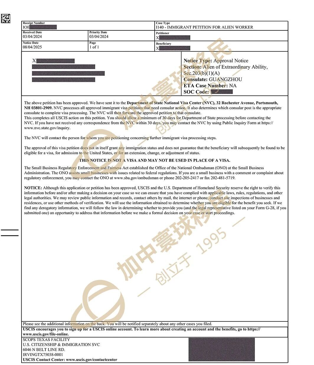 當下美國移民配額競爭進入 “白熱化” 階段,EB-1A 作為全球人才的 “優先通道”,獲批難度持續攀升。但就在這樣的大環境下,加中寰球又傳捷報 —— 深耕 IP 授權領域 20 余年的 X 先生,在無加急申請的情況下,僅用 17 個月就成功斬獲 EB1A 獲批通知!從 2024 年 2 月 29 日遞交申請,到 2025 年 8 月 5 日收到獲批喜訊,這份 “穩穩落地” 的成果,不僅是 X 先生行業實力的硬核印證,更彰顯了加中寰球在高端人才移民領域的專業底氣。在 IP 授權這個細分賽道,如何讓移民官看到核心價值?X 先生的獲批案例,藏著所有行業深耕者的移民答案!